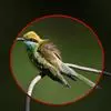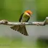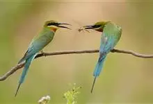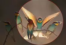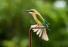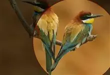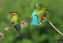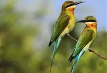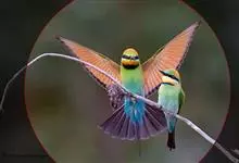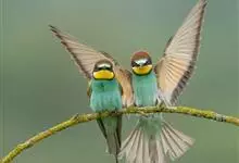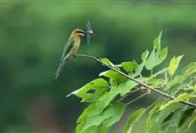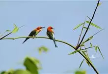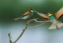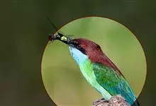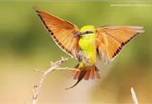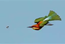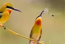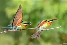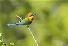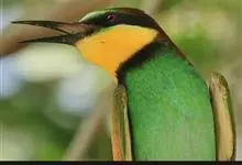 栗喉蜂虎是蜂虎科蜂虎属的鸟类。有热带鸟类羽毛艳丽的特征:喉部是栗红色的,黑色的过眼纹,翅膀和背部是绿色的,尾翼是蓝色的,飞行时翅膀下面的羽毛是橙黄色的,在阳光的照射下,它们全身闪烁着金属般的艳丽光泽,…全部>>