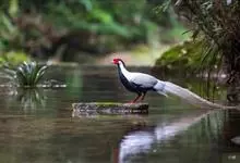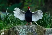 白鹇,是鸡形目雉科鹇属的一种留鸟。雄鸟上体白色并具黑色纹,下体黑色,头顶具黑色长羽冠,尾白而长;雌鸟体型较小,以橄榄褐色为主,下体具白色或皮黄色细纹;虹膜褐色,眼周具红色裸皮,喙黄色,脚鲜红色。…全部>>