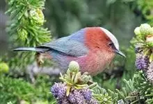 凤头雀莺:小型鸟类。体长9-10厘米,雄鸟呈毛茸茸的紫色和绛紫色,顶冠淡紫灰色,额及凤头白色,尾全蓝。雌鸟喉及上胸白,至臀部渐变成淡紫色,耳羽灰,…全部>>