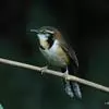 黑领噪鹛是雀形目画眉科噪鹛属鸟类,又名领笑鸫。头顶和上体褐色;眼先和眉纹白色;脸部具黑白相间的纵纹;颈侧至胸前具显著的黑色宽带,形成一半领环,其后方的颈背向下至两胁皆为棕黄色,其余下体白色;尾褐色,…全部>>