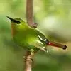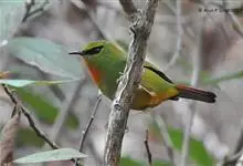 火尾绿鹛是莺科、绿鹛属小型鸟类,体长11-14厘米。上体绿色,头顶至枕具黑色鳞状斑,眼先和眼后黑色,眉纹黄绿色。两翅黑色具黄色和红色翅斑及白色端斑,极为醒目。中央一对尾羽绿色,外侧尾羽鲜红色。…全部>>