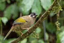 灰腹噪鹛是画眉科、噪鹛属鸟类。中型鸟类,体长21-25厘米。额黑色,头顶黑或灰色,眼先、脸白色。上体橄榄褐至棕褐色,尾和内侧飞羽具窄的白色端斑和宽阔的黑色亚端斑,外侧初级飞羽外翈蓝灰色或灰色,颧纹黑色。…全部>>