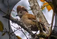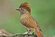 条纹噪鹛是画眉科、噪鹛属中型鸟类,体长28-32厘米。头具短的羽冠,上体栗褐色,飞羽外翻蓝灰色。下体棕栗色,腹以后转为褐白色。除飞羽和尾羽外,所有上、下体羽均具白色羽干纹。极为醒目。野外特征明显,…全部>>