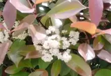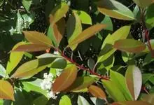 红叶石楠 是蔷薇科,石楠属杂交种,为常绿小乔木或灌木,乔木高可达5米、灌木高可达2米。叶片革质,长圆形至倒卵状、披针形,叶端渐尖,叶基楔形,叶缘有带腺的锯齿,花多而密,复伞房花序,花白色,梨果黄红色,…全部>>
