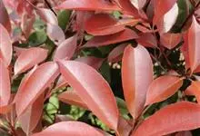 红叶石楠 是蔷薇科,石楠属杂交种,为常绿小乔木或灌木,乔木高可达5米、灌木高可达2米。叶片革质,长圆形至倒卵状、披针形,叶端渐尖,叶基楔形,叶缘有带腺的锯齿,花多而密,复伞房花序,花白色,梨果黄红色,…全部>>