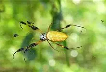 棒络新妇,是蜘蛛目肖蛸科络新妇属节肢动物。雄蛛体长约6毫米,背甲褐色,具黑色纵斑;步足黑色,有橙色环纹;腹部筒形、褐色,有黄斑;雌蛛体长约21毫米,背甲黑色,有大量银色长毛;触肢黄色,步足黑色,…全部>>