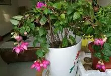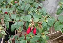 倒挂金钟是柳叶菜科倒挂金钟属亚灌木植物。茎直立,多分枝;幼枝带红色,被短柔毛与腺毛,老时渐无毛;叶对生,卵形或窄卵形,脉常带红色;常带红色,被短柔毛与腺毛;花筒红色,筒状钟形,…全部>>