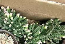 筒叶花月,是景天科青锁龙属的多年生草本植物。植株多分株,灌木状,茎较粗壮,圆柱形,表皮灰褐色;叶片肉质,互生,呈圆筒状,簇生于茎或分枝顶端,叶端呈斜截形,截面为椭圆形;花呈星状,淡白色;花期秋季。…全部>>