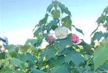 木芙蓉,锦葵科木槿属落叶灌木或小乔木。小枝上有细绒毛;叶片为卵状心形,托叶为披针形,常早落;花单生,花萼为钟形,花冠初为白色或淡红色,后逐渐变为深红色;果实为扁球形,有淡黄色的毛附着。花期8到10月。…全部>>