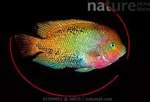 火口鱼(红胸花鲈)鲈形目 > 慈鲷科 > 丽体鱼属 > 火口鱼