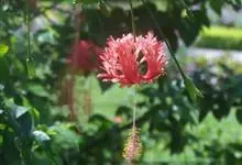 吊灯扶桑 Hook. f.)为锦葵科木槿属的常绿灌木。高达3米;小枝常下垂;叶椭圆形或长圆形,先端尖或短渐尖,基部楔形;花梗细,无毛或具纤毛,中部具节;蒴果长圆柱形;花期全年。因似灯笼高挂,…全部>>