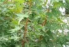 元宝槭为无患子科槭属落叶乔木,高达10米。叶长5—12厘米,宽8—12厘米,裂片三角状卵形,基部平截,稀微心形,幼叶下面脉腋具簇生毛,掌状;叶柄长3—13厘米。伞房花序顶生;雄花与两性花同株。…全部>>
